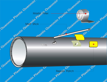 1、修補時,先除去損傷部位污物,并將該處聚乙烯層打毛,然后將損傷部位的聚乙烯層修切成圓形,邊緣應剖成銳角。在孔內填滿與補傷片配套的補傷棒或補傷膠,然后貼上補傷片,其大小應保證其邊緣距聚乙烯層的孔洞邊緣不小于100mm。貼補時應邊加熱,邊用輥子滾壓或戴耐熱手套用手擠壓,排出空氣,直至補傷片四周膠粘劑均勻溢出。
